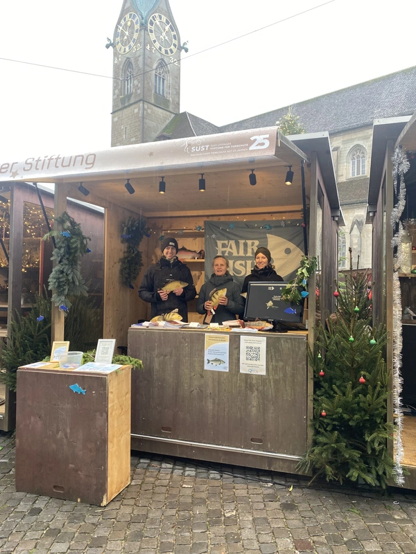 On 25 November, fair‑fish took part in the Münsterhof Christmas Market in Zurich with the team of Fausta Borsani, Laura Kamp and Yannick Rohrer. It was a great opportunity to talk with new and interested people about fish consumption.